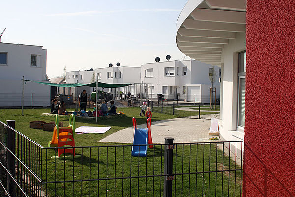 Erschlossen wird das Grundstück über eine Vorfahrt im Nordosten. Über einen Weg auf der Rückseite der Parkplätze können die Kinder gefahrlos zum Haupteingang gelangen. Die innere Erschließung geht von der Piazza im Mittelpunkt der Kindertagesstätte aus. Gemäß dem Motto „Es braucht ein Dorf, um ein Kind großzuziehen“ versteht sich dieser zentrale Raum als Dorfplatz. Hier trifft man sich zum Essen und Spielen.