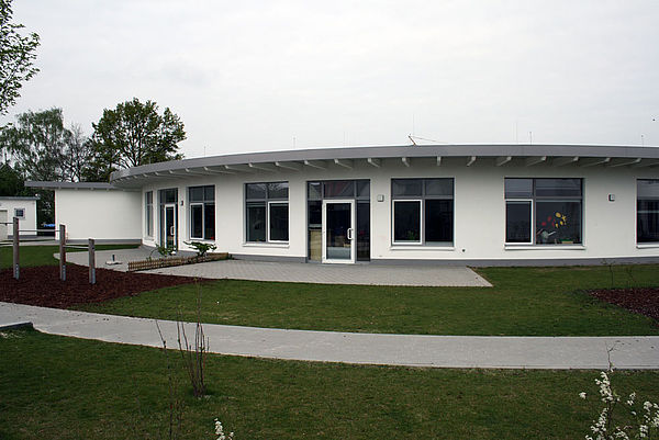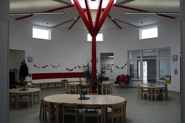 Als Grundform wurde, auch aus energetischen Gründen, der Kreis gewählt. Zunächst wurde ein Kreissegment ausgespart, um eine einfache Erweiterung zu ermöglichen. Aufgrund der hohen Nachfrage musste die Kindertagesstätte bereits nach kurzer Zeit erweitert werden.